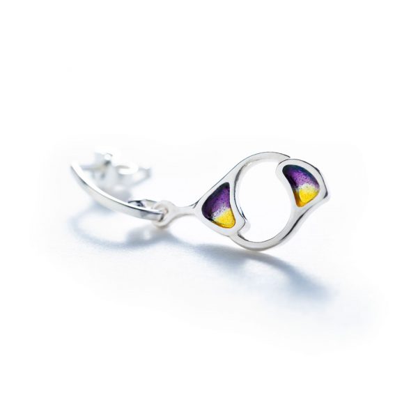 This single earring features the colours of falling night: moody purples with a hint of setting sun. Available in a matching pair or as an asymmetrical arrangement with its bigger sister, Nightfall 2.