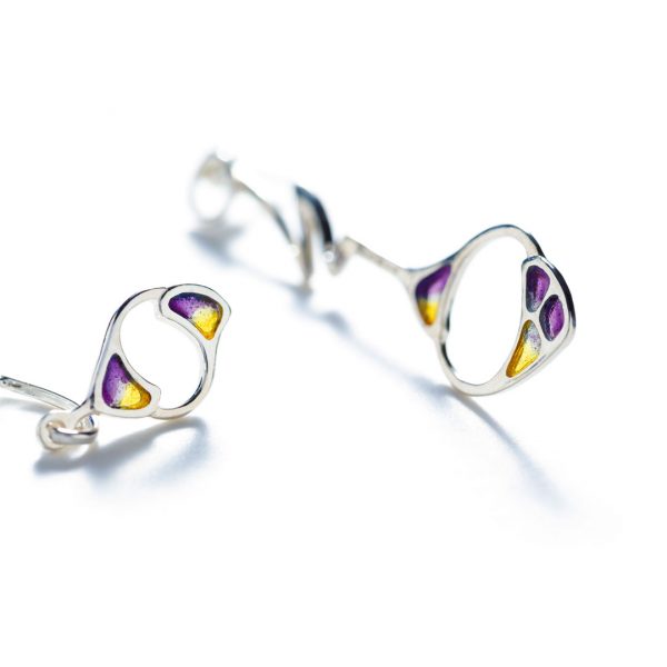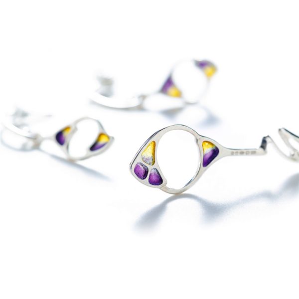 Made from Argentium silver, using the centuries-old plique-à-jour enamelling technique, which looks like stained glass windows, each piece is entirely unique due to its handmade nature. Argentium silver contains a slightly higher content of pure silver than traditional sterling and an added element of germanium. This makes the pieces hypoallergenic and tarnish resistant.