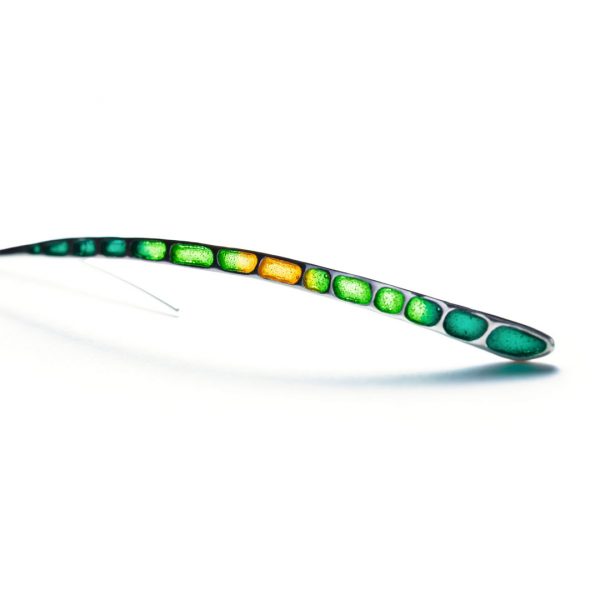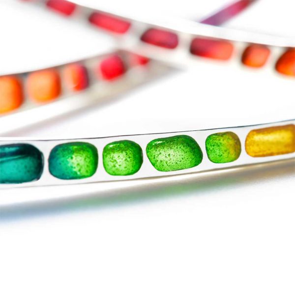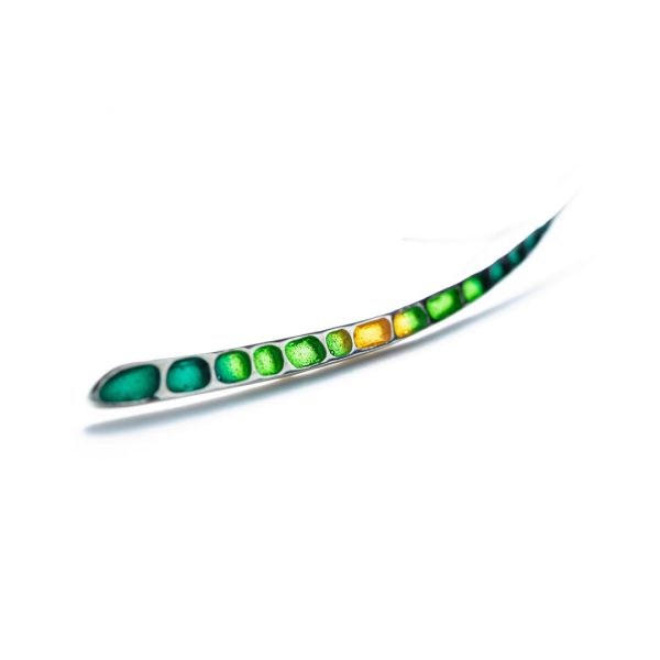 Made from Argentium silver, using the centuries-old plique-à-jour enamelling technique, which looks like stained glass windows, each piece is entirely unique due to its handmade nature. Argentium silver contains a slightly higher content of pure silver than traditional sterling and an added element of germanium. This makes the pieces hypoallergenic and tarnish resistant.